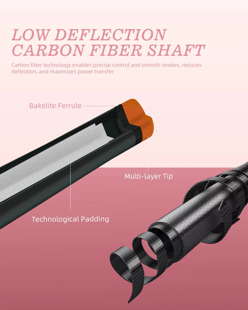 - 2. Carbon Fiber Pool Cue Stick Shaft: This carbon fiber pool cue shaft is filled with customized foam inside, which allows for less deflection on shots with a lot of spin, and it performs consistently and accurately, it is suitable for most professional players, giving players an edge on the table, and make you perform better than you can imagine.