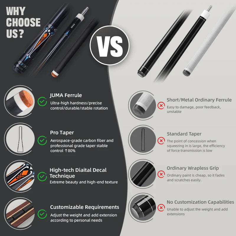- Aid you hit your ball accurately,with professional multi-layer tip,TT-PC ferrule,stainless steel 3/8*8 Radial pin cue joint.