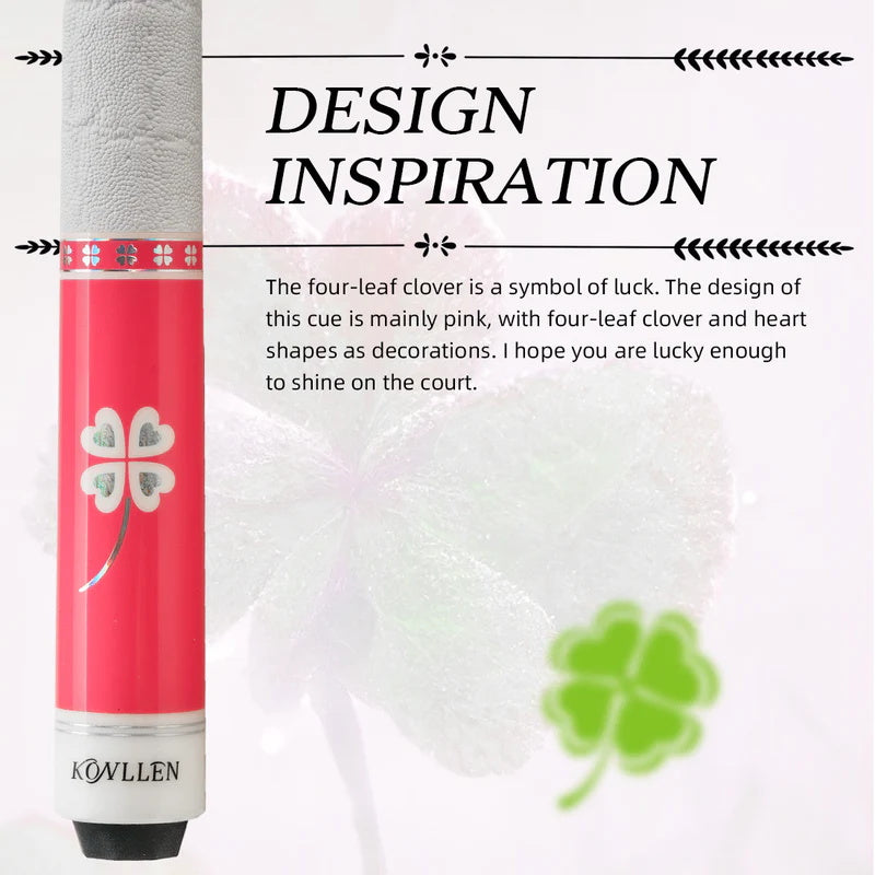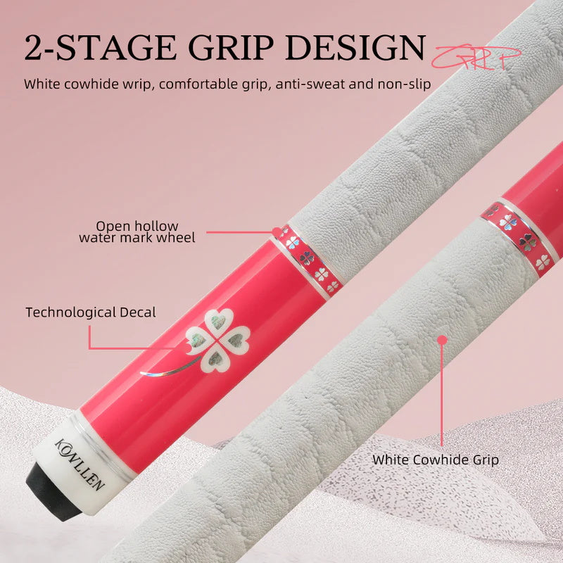 1. [Professional Carbon Fiber Pool Cue] As an upgraded version of the KL-Pink Clover series, the KL-Pink-Pro series replaces the maple shaft with a pink carbon fiber shaft, reflecting KONLLEN's outstanding craftsmanship. This pool cue is designed for women, with a length of 58 inches, equipped with a 12.5mm original multi-layer tip and XTC white ferrule. Every detail highlights KONLLEN's pursuit of exquisite craftsmanship and its high attention to female players.