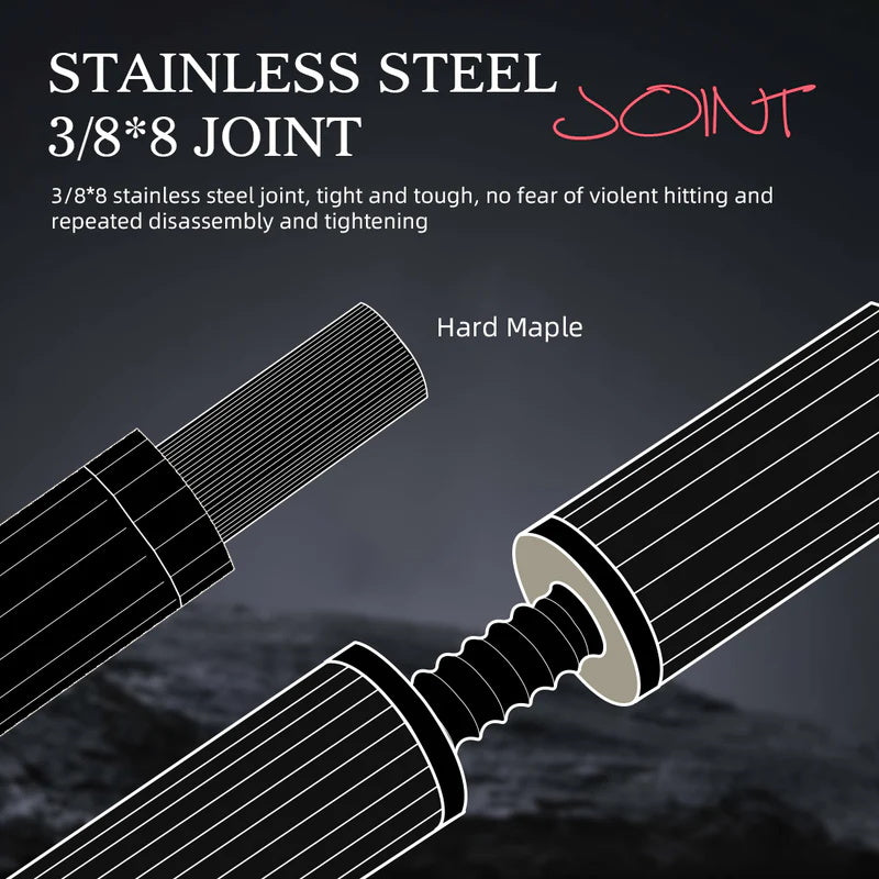 3. [Tight connection, no loss of force transmission] The stainless steel slow-speed 3/8*8 pin joint ensures the connection stability of the billiard cue, prevents bending, and protects the integrity of the pool cue. This design greatly reduces the shaft bending amplitude at the moment of hitting the ball, greatly improves the stability when hitting the ball, and meets the needs of female players for high-precision and high-stability billiard cues.
